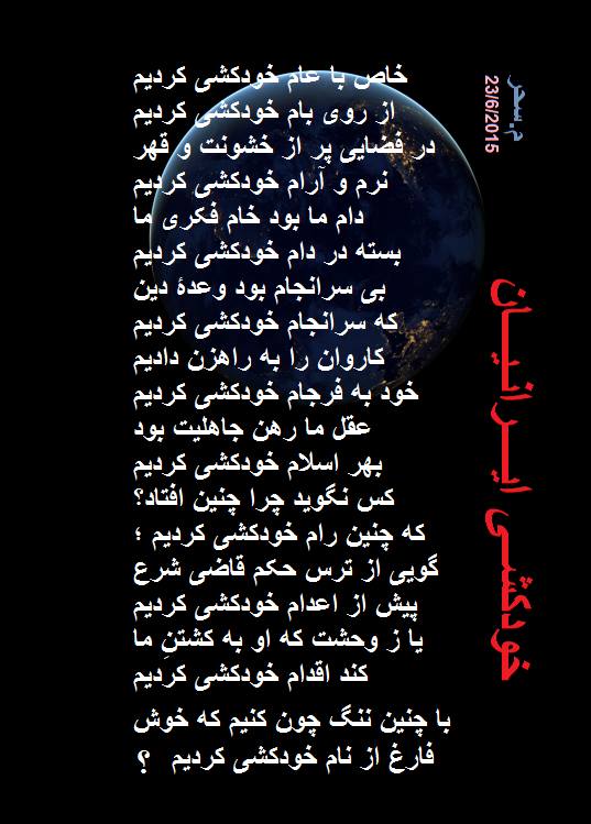 خودکشی ایرانیان خاص با عام خودکشی کردیم از روی بام خودکشی کردیم در فضایی پر از خشونت و قهر نرم و آرام خودکشی کردیم دام ما بود خام فکری ما بسته در دام خودکشی